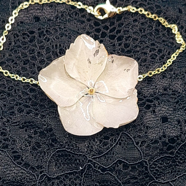 Comme un éclat de nature à votre poignet, ce bracelet délicat dévoile de véritables fleurs d’hortensia, immortalisées dans une résine cristalline.
