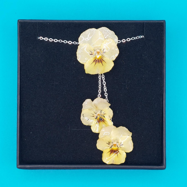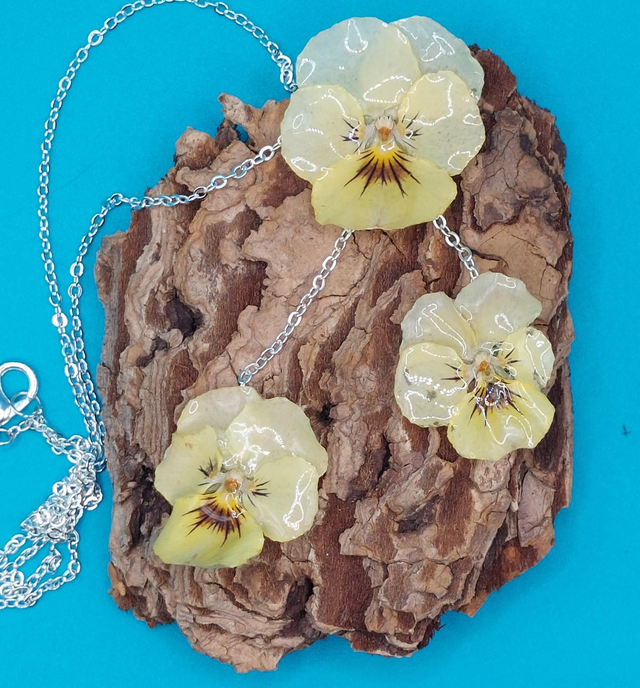 Collier 3 Pensées Argenté – Bijou floral fait main en résine brillante
