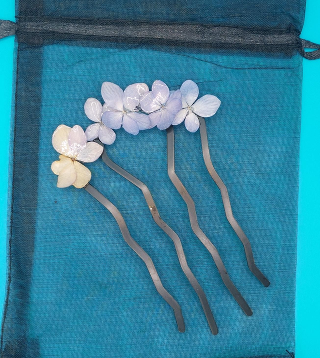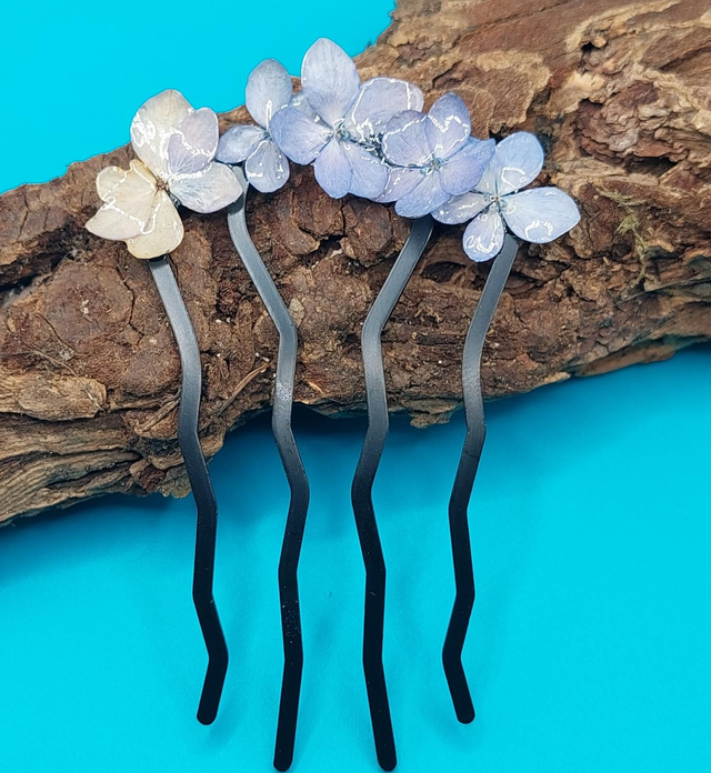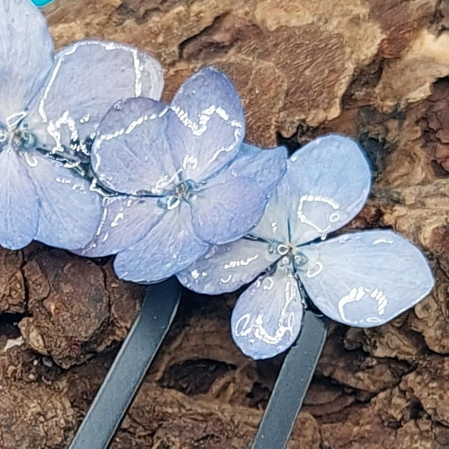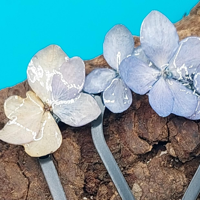 Un souffle de nature dans vos cheveux… Ce peigne délicat est orné de véritables petites fleurs d’hortensia, immortalisées dans une résine brillante qui capte la lumière.