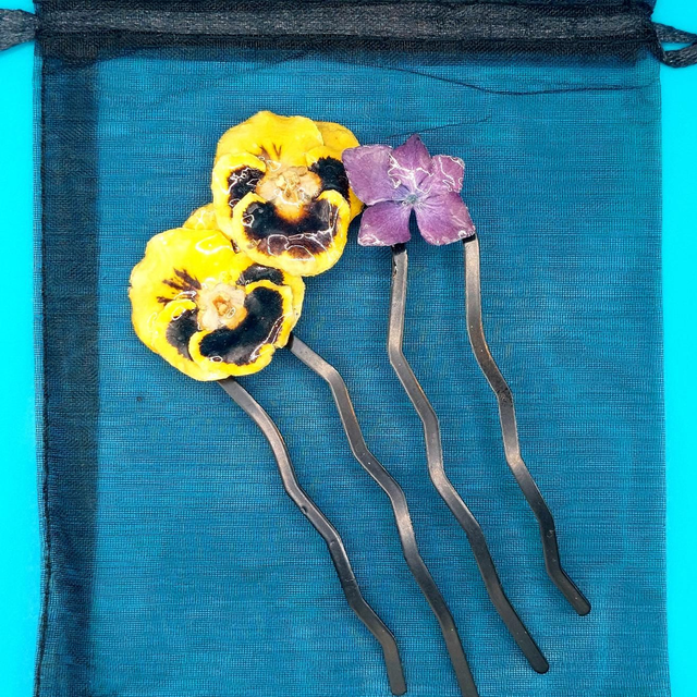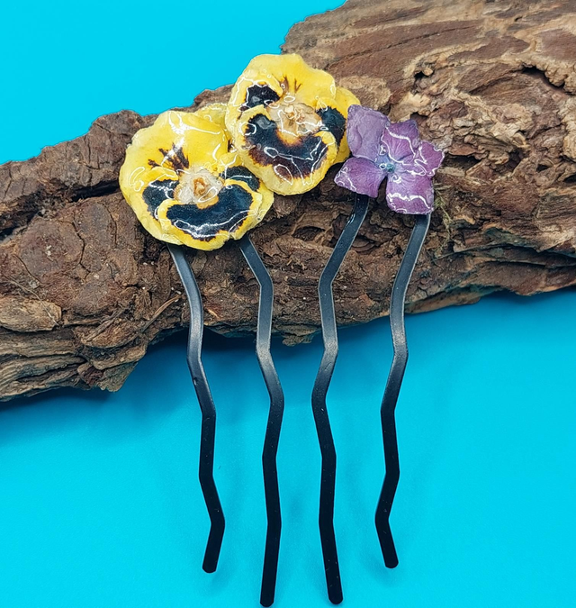 Deux pensées naturelles accompagnées d’un hortensia séché composent ce peigne poétique et élégant.